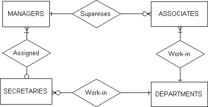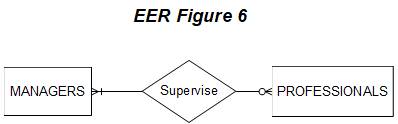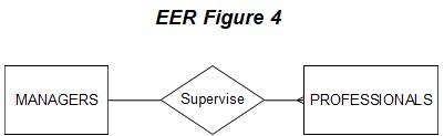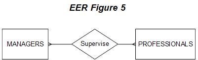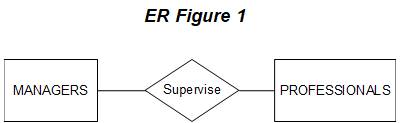Consider the following simple scenario regarding a public accounting firm: "managers supervise professionals." Analysis of this scenario suggests that there are two entities (managers and professionals) that are related through the act of supervision. The application of ER modeling to this scenario results in the simple ER diagram shown below. Note that there are two entity symbols -- MANAGERS and PROFESSIONALS and one relationship symbol -- "supervise" that links the two entities. Note that it is convention to label the relationship symbol so that the relationship reads from left to right; thus, the following diagram indicates that managers supervise professionals (rather than professionals supervise managers).