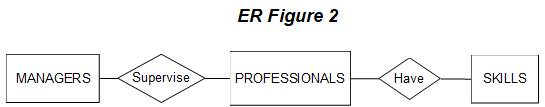 -- you may use any descriptive name. Also, depending on the name given to the relationship, the link between related entities can be read in either direction. In the figure above, since the name of the relationship between PROFESSIONALS and SKILLS is "Have," the appropriate way to read the relationship is "professionals have skills" (rather than "skills have professionals"!). To read the relationship beginning from the SKILLS entity, the relationship would have to be worded something like "possessed by" (skills are possessed by professionals).