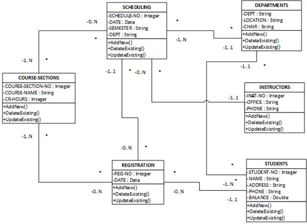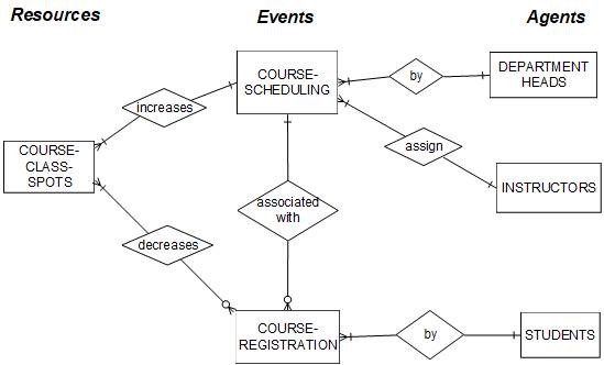 We briefly discussed Unified Modeling Language (UML) in the previous chapter. Recall that UML is an object-oriented modeling approach with a key difference relative to ER modeling -- structure, the static aspect of the system, and behavior, the dynamic aspect of the system, are modeled together. Shown below is a UML model that is roughly equivalent to the student registration REA model shown in the chapter.